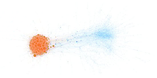 The community with higher HITS authority values is referred to as the red community and the other as the blue community. Therefore, both communities clearly show different behavior in how the content of accounts is retweeted. This is much more pronounced in the red community than in the blue community. This becomes even clearer when the retweet graph is plotted using an Atlas Force algorithm [28] and the node size is set proportional to the HITS authority values. Figure 5 clearly shows that the blue community looks “normal” and the red community has exceptionally many “authorities”. These “authorities” fuel the red echo chamber.
