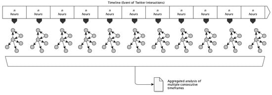 Principle of how the echo chamber evaluation was conducted. Consecutive timespans were taken in each case. For each of these periods, a graph was formed and evaluated. The totality of the results of all graphs was evaluated within the framework of the evaluation as well to be able to collect statistical fluctuation ranges.