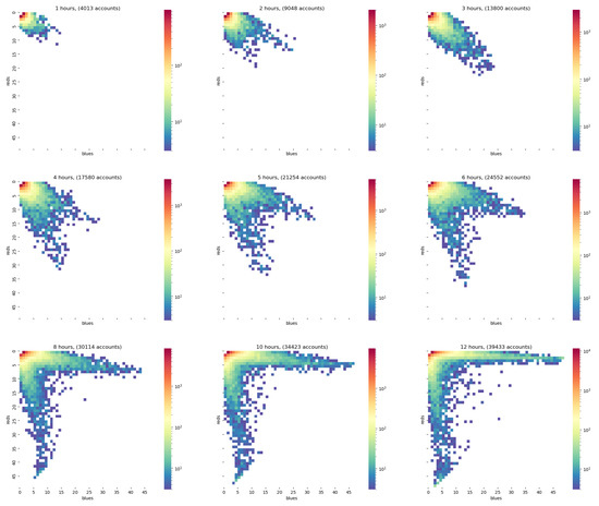 A retweet graph was created for n hours, and the red and blue communities were determined as shown in Section 2.2.1 and Section 2.2.2. This graph was compared to the graph of further m previous consecutive periods of n hours to determine how stable the red and blue assignments were for individual accounts. The evaluation examined 45 time periods between 1 and 24 h. Of course, it is unlikely that individual accounts can be unambiguously assigned to only one of the two communities (some accounts can share the positions of both communities). For stable echo chamber detection, it is necessary to recognize clear red and blue domains, which statistically indicate that predominantly red or blue content is shared. The result of this analysis can be found in Figure 7, which shows that the duration of a period plays a significant role. The distributions for one hour to three hours (first row of Figure 7) have a more circular or oval character and are formed along the main diagonals, from 4 to 6 h of recording time (second row of Figure 7); the reader observes how two fingers are formed to the left and right of the main diagonal, which correspond to a red and a blue community.