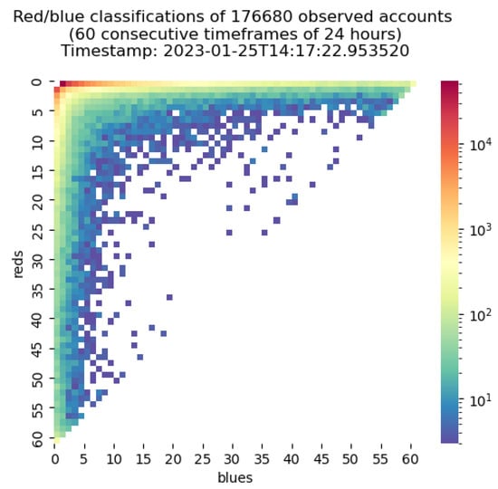 Visualization of the frequency of blue/red classifications of about 180,000 Twitter accounts in two months. A 24 h time window was always used to classify an account as red or blue.