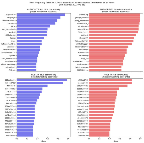 In particular, since the classification into red and blue areas is based solely on interactions and not content, little can be said about the nature of the red and blue communities, except that the red community shows strikingly different retweet behavior than the blue community. Why this is so, and what content is distributed in such a strikingly different way, was based on a preliminary content analysis of the accounts that achieved the highest authority metric scores overall observed periods. Based on the observed interaction patterns, these accounts are retweeted most frequently and are considered “trusted sources” or opinion leaders for the respective communities, thus setting the “tone in the community”. Therefore, for this study it was decided to work with a period of 24 h and 60 consecutive time frames which leads to a stable classification for plenty of accounts (see Figure 8).