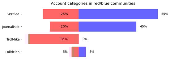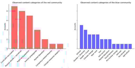 Figure 9 shows the result of this analysis for the blue and red communities. Table A1 and Table A2 in Appendix A list further information per account, such as the description, the verification status (Twitter blue tick), or content categories. A verified account on Twitter is an account with a blue badge next to the account name, indicating that Twitter has confirmed that the account is of public interest and is the authentic account of the person or entity it represents. Following the Twitter acquisition by Elon Musk, the criteria have changed as follows. To receive or retain a blue checkmark, an account must meet the following criteria: it must be subscribed to the Twitter Blue program (paid accounts), have a display name and profile photo, be an active account with a confirmed phone number, show no signs of being deceptive or engaging in platform manipulation, and have no spam activity. This verification helps users differentiate between authentic accounts and impostor accounts.