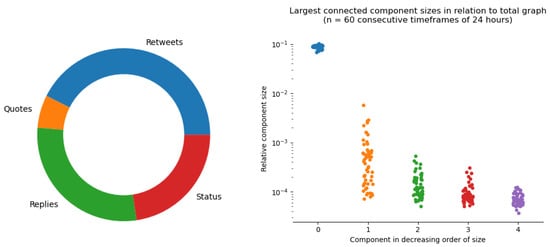 The second question is how large the proportion of the largest connected component is within the overall retweet graph. Figure 12 (right side) shows this ratio for all 60 24 h graphs of the observation period. According to this, the largest connected component makes up about 10% of the full retweet graph. The second largest connected component only accounts for a maximum of 1%, and so on. The reader should consider that only accounts retweeted at least once were counted as part of the largest connected component. If we also include accounts that have not been retweeted once, the largest connected component would make up about 80% of the total graph (not shown in Figure 12). However, most of these accounts would be “dead and inactive” endpoints.