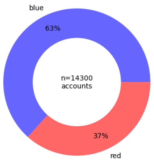 The reader should be aware that the presented approach derives insights into only about a third of the available data (retweets only), enabling categorizations of about 10% of the observed retweet network. Therefore, few conclusions about the bulk of the network’s interactions and accounts can be drawn. Estimates refer to only about 10% of the total network, of which about a third show “unusual” communication patterns. A typical ratio between the red and blue portions in the largest connected component is shown in Figure 13.