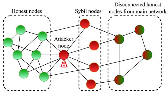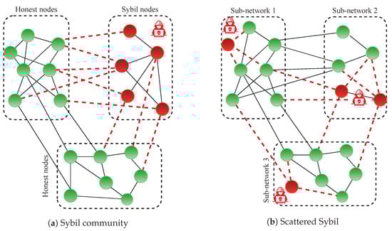 In the case of a “Sybil community” attack, as illustrated in Figure 2a, the attacker creates many connections within the Sybil community, meaning that Sybil nodes are strongly connected to each other. However, the Sybil community has limited ability to connect with trustworthy nodes. In other words, there are only a few connections between Sybil nodes and honest nodes.