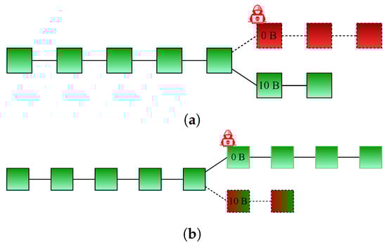 Ledger state in a Double-Spend attack. (a) Create a separate ledger version by forking the original blockchain by attacker. (b) Takeover the main chain by attacker.