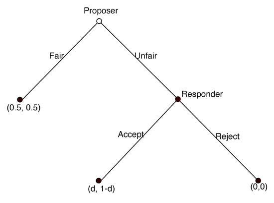 A system for fair taxation establishes the foundation for an ultimatum bargaining game [] based on concerns about the network’s goals and the fairness of charging network nodes. The ultimatum game (Figure 4) has grown in popularity as a tool for economic experimentation. The ultimate game can be modelled as follows: