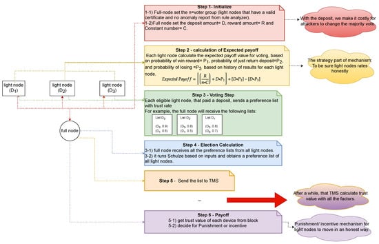 The proposed procedure for our system is depicted in Figure 5 and comprises six steps that are performed for each epoch. These steps are carried out by full nodes that act as committee members responsible for running the incentive mechanism. In order to determine the fair amount of tax that each light node should pay, the committee members use game theory concepts that take into account the light node’s behaviour and wallet balance within the network.
