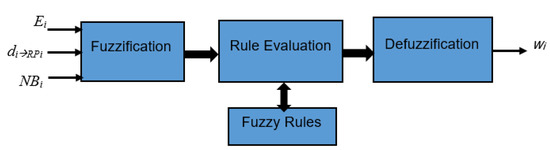 The output of the FIS determines a weight value wj between 0 and 1. The weight value increases if the distance is high or the energy of the node is low. The output weight value influences the change of the RP location. The sensor node with a higher weight value has more impact to change the location of the RP toward its location. Figure 2 shows the block diagram of the proposed Fuzzy_RPs. It consists of the basic four stages of FIS: fuzzification, evaluation of the fuzzy rules, aggregation, and deffuzzyfication of the output fuzzy sets where the Mamdani model is used for this purpose.