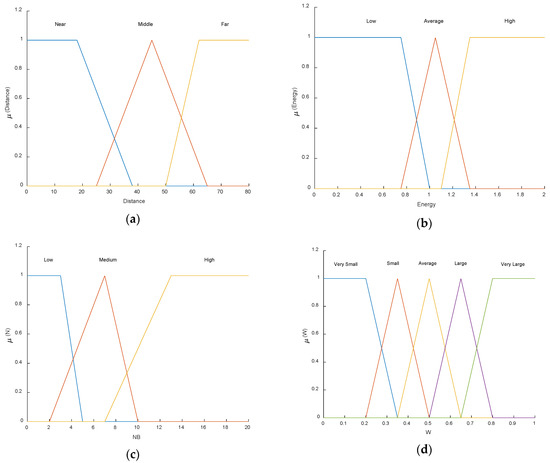 Membership functions of the inputs and output. (a) Membership functions of input Distance. (b) Membership functions of input Energy. (c) Membership functions of input (NB). (d) Membership functions gof output w.