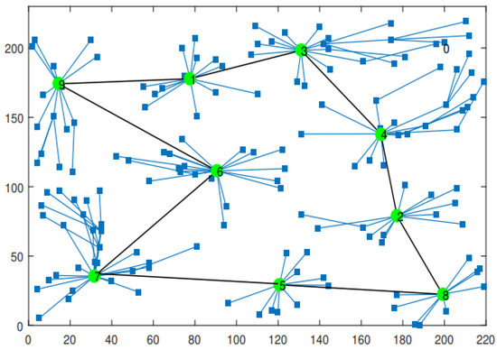 Figure 4 and Figure 5 show the area of the sensing field and the network conditions using the DBRkM approach and the proposed FUZZY_RPs approach, respectively. As shown in Figure 4, the sensor nodes that are associated with RPs 3 and 4 suffer from high hop count and large distance. On the contrary, Figure 5 shows that the locations of RP 3 and 4 are updated at round 175 to balance the distance between the sensor nodes towards the RPs and to reduce the average hop count. These two figures are presented to show that the RPs are built and changed dynamically in the FUZZY_RPs approach (Figure 5) while the RPs’ locations are fixed in the DBRkM approach.