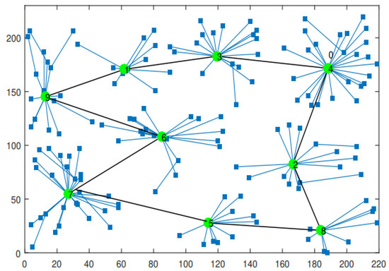 where c is the number of RPs obtained using Algorithm 1 () and v is the MS speed. Some WSN applications require that the sensed data should be collected within a specific delay limit. Therefore, depending on the WSN application (for example, a real-time application), the path length should not exceed a threshold value (). Based on that, in Algorithm 1, after determining the candidate set P as RPs using k-means algorithm, only c RPs of this set will be selected to build the MS path.