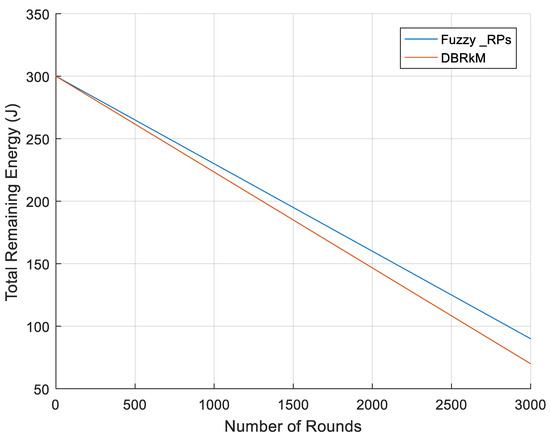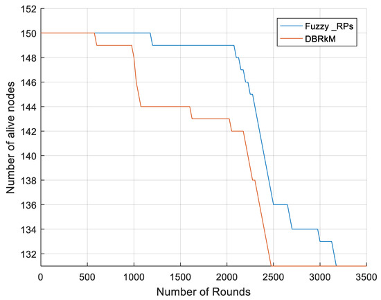 In this section, we compare the performance of the proposed approach with the DBRkM approach in terms of network lifetime. Three metrics are used for this purpose: the number of alive nodes, total remaining energy, and standard deviation of the remaining energy. Figure 6 shows the number of active nodes per round in both algorithms. The figure shows a significant improvement of the proposed Fuzzy_RPs approach compared to the DBRkM approach. This improvement is achieved by updating the locations of the RPs based on the energy of the nodes and therefore avoiding the energy holes around the RP.