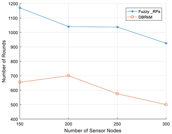 Figure 9 shows the network lifetime when the number of sensor nodes is changed from 150 through to 300. The network lifetime in this figure represents the number of rounds until the first node in the network dies. As shown in the figure, the proposed Fuzzy_RPs approach always outperforms the DBRkM approach. Table 4 shows the percentage of improvement that has been achieved by using the Fuzzy_RPs approach compared to DBEkM approach.