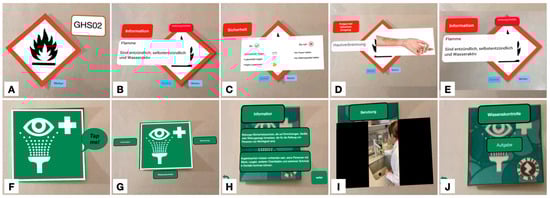 AR-enhanced stickers. (A–E) AR contents of the GHS02 sticker, (F–J) AR contents of the eyewash station sticker.