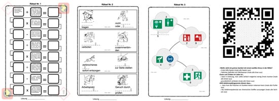 At the beginning of the lesson, the teacher provides an overview of the lesson’s objectives and divides the students into groups of 2–3 individuals, attempting to maintain equality among the groups. Each group is then given the necessary materials to begin the laboratory rally. The students are encouraged to start the rally independently by first reading the information text about the story. They will learn that it is an exit game whose goal is to solve specific riddles related to safety in the lab. The students can then start solving the various riddles by using the worksheets shown in Figure 4.