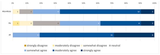 As can be seen from Figure 5, mainly positive results could be found for the factors PEU+PEUU, PU and AT, of the TAM questionnaire. Thus, 2 students strongly agreed with the statements of the factor PEU+PEUU, 12 moderately agreed, 4 somewhat agreed, 2 were neutral towards the statements and only one student somewhat disagreed with the statements. The AT factor also shows that 6 students strongly agreed, 11 moderately agreed, and four somewhat agreed with the statements. No student was neutral or negative towards the statements. The PU factor was rated less clearly by the students. Thus, 2 students strongly agreed with the statements, 6 moderately agreed, 6 somewhat agreed, 4 were neutral towards the statements, 2 somewhat disagreed and 1 student moderately disagreed.