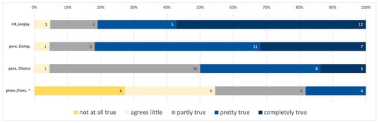 The results of the questionnaire, which can be seen in Figure 6, indicate that the investigated teaching unit has evoked a high degree of intrinsic motivation among the students. Thus, the factor interest/enjoyment shows That 12 out of 22 students believed the corresponding statements to be completely true and another 5 out of 22 students believed the statements to be pretty true. Only 3 students thought that the statements were only partially true, and one student agreed little with the statements. Similar results, though not quite as strong, were seen in the evaluation of the perceived competence factor, where 7 students believed the statements to be completely true, 11 believed the statements to be pretty true, 3 students believed that the statements were only partially true, and one student agreed little with the statements.
