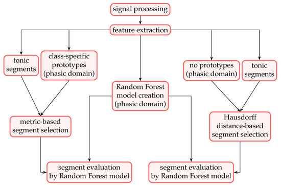 Complete process of the evaluated experiments. The random forest model is trained solely on the phasic domain samples. The evaluation follows one of the two available branches. The left branch represents the prototype-based evaluation, whereas the right branch represents the Hausdorff distance-based evaluation. Note that the Hausdorff distance is the only evaluated metric in which no prototypes are computed. The knowledge transfer from the phasic domain to the tonic domain is performed by the evaluation of the individual segments.