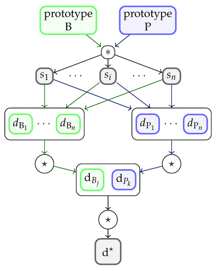 Segment selection process. The *-operator denotes the metric-based distance computation between the prototypes and each segment . Parameters and denote the resulting distance values for the baseline (B) and pain (P) prototypes, respectively. The ⋆-operator denotes the selection operator (here: minimum) performed on the vectors of the obtained values. and denote the lowest distances to the prototypes. The overall lowest distance is obtained when the ⋆-operator is applied to and . The segment, to which the value belongs to, is selected and evaluated by the model. (Note that this approach is applied in combination with all evaluated metrics defined above, except for the Hausdorff distance).