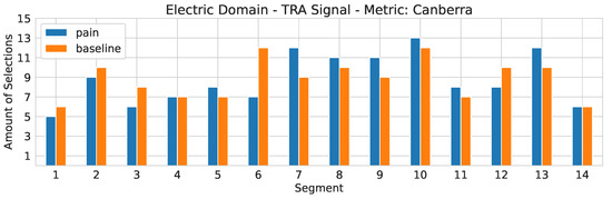 The selection frequency of each segment is depicted in Figure 3, in combination with the TRA signal and the Canberra metric. As presented in Table 3, the 6th segment is the best-performing segment of the tonic samples. However, as it can be seen, not only the 6th segment is selected when the metric is applied. Therefore, under the assumption that the best results of the individual segment evaluation provide upper bounds for the segment selection-based approaches, it is not possible to determine the optimal segments by computing the distances between the phasic electric prototypes and the corresponding segments. However, it seems that for the TRA signal, the segments which are determined in combination with the Chebychev and Canberra metrics, contain enough useful information for the analyzed classification task.