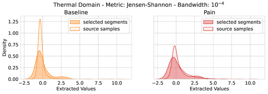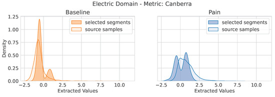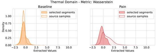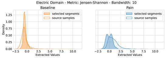 To further investigate the information contained in the selected segments, we collected the most important feature from the phasic electric domain by applying a 3-fold cross-validation in which each left-out fold contained the data of of the available subjects. We analyzed the obtained RF model of each fold and gathered the most important feature from the three evaluations. For the obtained feature, we analyzed the extracted feature values, specific to each class for the phasic domain samples and the selected segments. The distributions of the extracted feature values are depicted in Figure 4. As it can be seen, for both baseline and pain, the distributions of the extracted feature values show similarities between the phasic samples and the selected segments. In Figure 5, we provide a similar observation for the TRA signal in combination with the Jensen–Shannon metric with the bandwidth set to ten.