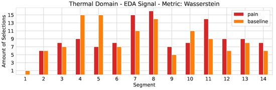 For the thermal pain domain, we observed a delayed body reaction to the induced pain stimuli. Similar to the phasic electric domain, we collected the most important feature, specific to the thermal pain domain, with the approach described in Section 7.1. The distributions of the extracted feature values for the most important feature in the thermal domain for the TRA signal in combination with the Jensen-Shannon metric and the bandwidth set to are depicted in Figure 6. As it can be seen, the distributions for the extracted feature values for both, baseline and pain, in combination with the phasic samples and the selected segments show similarities. In Figure 7, we provide a similar observation for EDA signal in combination with the Wasserstein metric. The selection frequency of each segment is depicted in Figure 8, in combination with the EDA signal and the Wasserstein metric.
