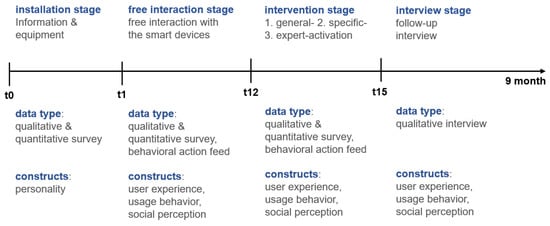 However, social roles and interactions are established over time in natural interaction environments. Therefore, longitudinal studies are valuable in understanding how the perceived role influences usage behavior and social perceptions of IVAs. They also give users the necessary time to establish a social relationship with the device [11]. Despite the growing importance of the relationship between humans and IVAs, there is a lack of longitudinal studies that focus on the social aspects of this relationship. Most longitudinal studies focus on describing usage patterns and behaviors [12,13], with relatively little attention given to the social aspects of human–technology interactions [14]. Since social roles on technologies and the attribution of social counterparts are often perceived unconsciously, using mainly explicit measurement methods falls short or even causes reactance [15,16,17]. Long-term studies also allow for a multifaceted capture of interactions, such as continuous interaction data.