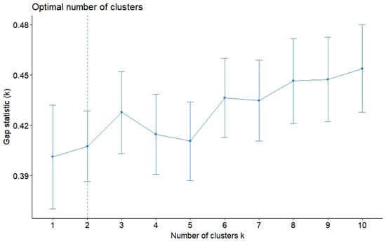 The parameters used to group participants in the K-means cluster analysis were Sharabany’s six subscales of perceived friendship quality [58]. The procedure was computed using the R package, Stats, and the Euclidean distance was used as the measure of dissimilarity. The optimal number of clusters was determined using a gap-stat plot [61,62]. As shown in Figure 2, the optimal number of clusters in the data with k = 2 was determined using the NbClust package in R, which used 30 simultaneous processes to identify the optimal number of clusters (see the vertical dashed line in Figure 2). Ten indices supported a solution with two clusters according to the majority rule, whereas 6 indices suggested 3 clusters, 3 indices suggested 8 clusters, 1 index suggested 9 clusters and 3 indices suggested a 10-cluster solution. On this basis, we decided on two clusters.