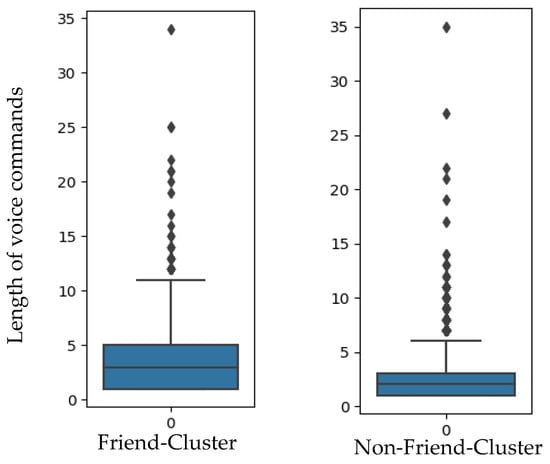 Our analysis revealed differences in the usage behavior between individuals from the friend cluster and the non-friend cluster. The friend cluster was more likely to use the voice assistant for functions related to support, mood management, and knowledge acquisition. More specifically, IVAs were more often used, for example, for checking the news, as an alarm and clock, or as a calendar. There was also a tendency for individuals from the friend cluster to use the voice assistant to boost their self-esteem (sample voice command: “Say something nice to me”) and have more fun with the IVA to entertain themselves (sample voice command: “Activate self-destruction”). The friend cluster was also more likely to apologize to their voice assistant than the non-friend cluster. The friend cluster tended to interact more socially with the IVA. Thus, the friend cluster was more interested in the voice assistant’s personality (sample voice command: “Do you have friends?”, “How are you?”, or “How old are you?”), more likely to greet or say goodbye to the voice assistant, and more likely to address it using the personal pronoun “you”.