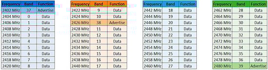 In low power mode, it uses frequency division multiple access (FDMA) and time division multiple access (TDMA) multiplexing with 40 transmit and receive channels. Each channel is separated by 2 Mhz, three of which are used exclusively for announcements and the remaining 37 for data and message announcements. Bluetooth channels are chosen randomly and using frequency spread spectrum (FHSS) as this technique also reduces interference between channels, see Figure 1.