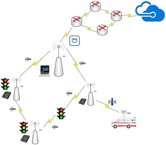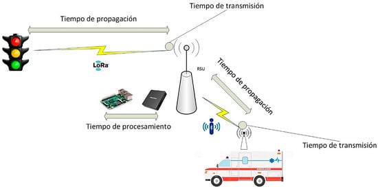 Similarly, green wave technology would enable an emergency vehicle that allows traffic lights to turn green as you cross the intersection. This study is based on an implementation using RFID technology, in which the RSUs have readers to receive the signal from the tags installed in the vehicles [,]. The disadvantage of this system is that having a passive RFID tag unable to energize leads to possible misuse of the system because, if the vehicle is not in an emergency, the traffic lights will continue to be activated. Along the same line, CCTV systems are installed in different cities with an image processing technique. The downside of this system is that in bad weather situations, like rain or fog, there may be an inadequate or inaccurate response for emergency vehicles.