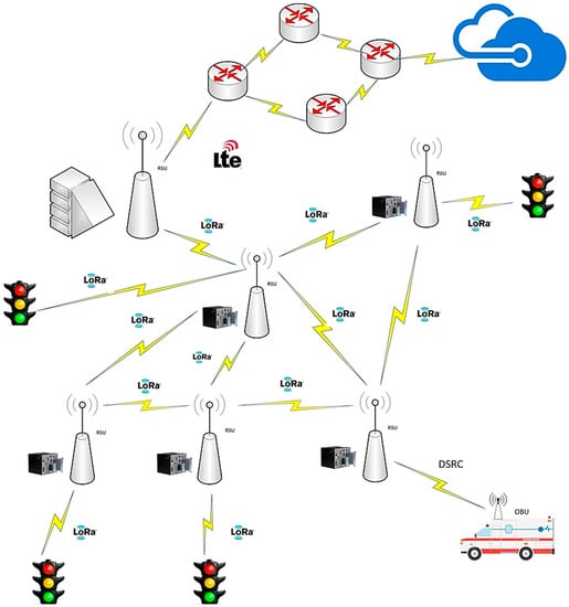 Figure 4 shows a network topology like Figure 3, with the difference that there are more fog computing nodes distributed among intersections to activate traffic lights via LoRa. Three fog computing nodes can be seen managing the lower nodes and a parish or metropolitan node with wide area network (WAN) connectivity via long-term evolution (LTE) or LTE category M1, the latter being an IoT protocol for real-time applications. The fog computing nodes are Cisco IR 910 industrial routers []. These devices can run any Linux distribution and add LoRa modules for connectivity. Communication from Vehicle to Infrastructure (V2I) is through Dedicated Short-Range Communications (DSRC), which is standardized in the IEEE 802.11p protocol on the frequency of 5.9 GHz, which has the advantage of being a licensed frequency and does not suffer interference with medical bands (ISM).
