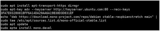 Commands for the installation of Mono Project on Raspberry Pi OS.