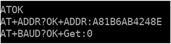 Once the connection between pins is established, depending on the operating system, the serial communication program Putty for Windows devices or CoolTerm for Mac devices is opened. Communication is established at 9600 baud and the COM port to which it is connected to the computer. Send the AT command, and the HM-10 module will reply with “OK” messages when it accepts the commands. Immediately after the module responds, various AT commands can be entered to query the MAC address, name, communication, etc. Figure 6 shows how the module responds based on the command entered. In this case, the MAC address is queried, and the communication speed is set to 0, which represents 9600 baud.