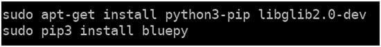 After configuring the HM-10 module as a beacon, any other device that is in scanning mode can receive the message with its RSSI, which has a window of 100 milliseconds that the HM-10 transmits. To listen to the message in the fog computing nodes, the integrated Bluetooth 4.0 module in the Z83-F or the Raspberry Pi 3 B+ is used. In the case of the Raspberry Pi 3 B+, to decrypt the messages and obtain the RSSI of the beacon, it is necessary to install the bluepy library available in the Python programming language []. The commands described in the first line install the latest version of the Python compiler and then install the bluepy library, as shown in Figure 7.