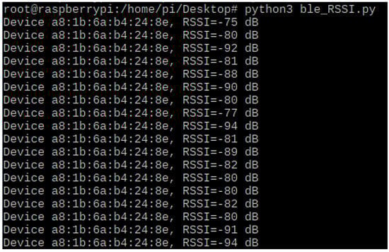 At the end of the installation of the library and the Python compiler, we proceed to create a script with the name “ble_RSSI.py” to obtain the MAC address and RSSI of the HM-10 beacon. The script in Figure 8 instantiates a scanner object to access library functions and get values such as UUID, MAC address, RSSI, and other parameters based on the programmer’s requirements. A full-featured infinite loop is created to scan beacons with a defined time every 50 milliseconds []. For function accesses, each device is scanned, and then the following function collects and prints the MAC address and RSSI of the HM-10 beacon. To run the script, open the Raspberry Pi OS terminal and, with the command “sudo python3 ble_RSSI.py”, run the command and get the first output.