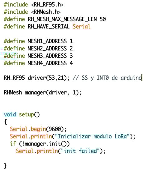 The implementation of the LoRa module with the ATMEGA 2560 and SAM D-21 microcontrollers requires the Radiohead library for the communication between these devices and the establishment of the mesh network. Figure 9 shows how the RH_RF95.H and RHMesh.H libraries are included; the first is for the communication of LoRa SX1276 and SX1278 modules, while the second library allows enabling these transceivers as mesh-type devices. The SPI pin is set for synchronous communication between the microcontroller and the transceiver [,]. This pin is 53 on the Arduino board and sets external interrupt 0 located on pin 23.