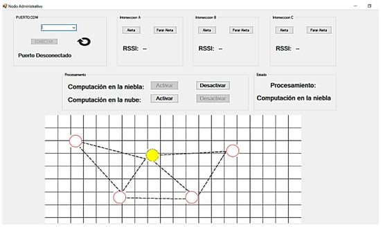 In fog computing, since there are hierarchical nodes, it is considered an administrative node that verifies the activity or inactivity of the nodes in a zone. This node has a program with a graphical interface and can manage these nodes, as in Figure 11. Through this interface, it is possible to observe the operation of these and provide processing in case a node is down. This node has the capacity of WAN connectivity to the cloud computing service so that the entire system can be constantly monitored, complying with machine-to-person (M2P) interaction.