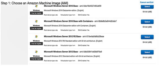 Selection of the operating system in a virtual machine on AWS.