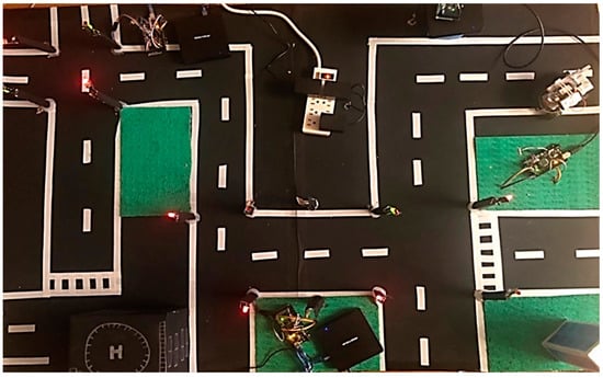 The prototype in Figure 16 is carried out on a 90 cm wide by 50 cm long model, which consists of a road with three traffic light intersections to the destination. In the prototype, there are four fog computing nodes, out of which three of their RSUs are capable of scanning and receiving alert messages via beacons []. The remaining node oversees the management of RSUs in this area and redirects priority information to cloud computing. This administrative fog node runs a graphical interface where the nodes can be managed, and in case any node fails, it can distribute the processing among the other RSUs.