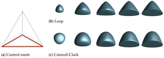 - DeRose, T.; Kass, M.; Truong, T. Subdivision surfaces in character animation. In Proceedings of the 25th Annual Conference on Computer Graphics and Interactive Techniques, Orlando, FL, USA, 19–24 July 1998; pp. 85–94. [Google Scholar]