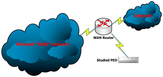 The study of whether the exchanged information is secure or not can be most easily and quickly accomplished by using IP network modeling platforms. Thanks to these platforms, models of IP networks composed of multiple and different network devices can be created [1,2,3]. This can create a miniature model of the real IP network to which a PED would connect and subject it to tests to verify the security of information exchange. Furthermore, through this model of an experimental IP network, different methods, techniques, and technologies can be applied to secure the information transmitted by the PED. Thanks to these platforms, one can trace and monitor in real time what is happening in the modeled IP network when using the corresponding technique or technology to secure the data exchange. Thus, after the end of the study, it can be stated with certainty whether the information generated by the studied PED is secure or, if it is not secure, whether the techniques, methods, and technologies applied have resulted in ensuring the security of the data generated by the PED.