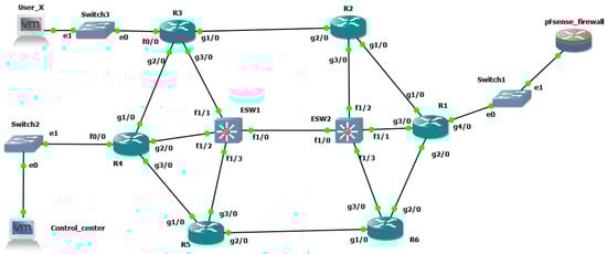 Figure 2 represents the topology of the modeled WAN. It is composed of a set of six routers (R1 to R6) and five switches (Switch One to Three and ESW One and Two). R1 to R6 are emulations of real routers. They have all of the capabilities and features of the real routers they are emulating. Switch One to Switch Three are simulations of network IP switches. These switches are layer two and are unmanaged. ESW One and Two are emulations of real managed layer three switches. On these layer three switches, nothing is configured (like out of the box), and they are working like ordinary unmanaged layer two switches. Access to the real networks and the Internet is achieved using the pfSense software firewall. The pfSense firewall is used as a border router. It is free and has a lot of capabilities and features to secure the network from inside and outside [36]. In the modeled network, the MPLS (Multiprotocol Label Switching) technology is used along with EIGRP (Enhanced Interior Gateway Routing Protocol). No other configuration such as QoS (Quality of Service) or load balancing are made in the modeled network. The studied PEDs are accessed from the control center, which is a virtual machine connected to the modeled IP network. The control center accesses only the studied PEDs. User_X is some user in the modeled WAN that represents another virtual machine that accesses any resources on the Internet. The idea of this User_ X is to simulate other users in the modeled network accessing different resources on the Internet.