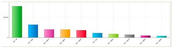Figure 11 shows which ports generate the most traffic. As can be seen, the results are similar to the same ones obtained for the PDU. This is because the UPS is also only accessed through a web browser, so TCP port 80 has generated the most traffic. UDP (User Datagram Protocol) port 5355 is used for LLMNR (Link-Local Multicast Name Resolution) device discovery for SNMP (Simple Network Management Protocol), UDP port 53 is used for domain name resolution, and UDP port 137 is a NETBIOS Name Service. The difference with the results for the PDU is due to the fact that a different operating system was used for the UPS study, which generates traffic on these ports. The other TCP ports are again for data exchange with the OS developer’s servers.