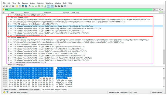 Figure 13 represents the code that is sent to visualize the different parameters that are measured by the UPS. From the figure, it can be seen that these are the different parameters that are monitored for the battery status and these parameters are related to the output voltage such as current, voltage, frequency, power consumption, and many more. Thus transmitted, this data can be modified and can be subject to data integrity attacks.