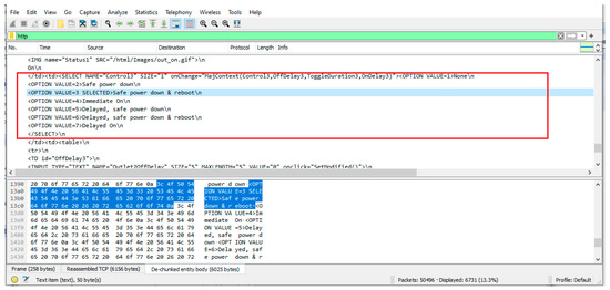 Figure 14 shows the code that is sent when the UPS shutdown methods menu is selected. As can be seen from the results here too, the information is exchanged between the UPS and the control center in plain text. In this case, it can be seen that the “safe power down and reboot” shutdown mode is selected.