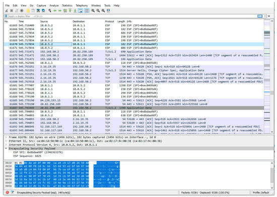 In the modeled “WAN” network (from Figure 2), a tunnel is created between R1 and R4 that passes through R1, R2, R3, R4, and vice versa. Figure 15 shows the results of the data exchange between the PDU and the control center. The results when accessing the UPS are exactly the same and therefore will not be shown. Note that 10.0.5.2 is the IP address of the interface g1/0 of R4 and 10.0.1.1 is the IP address of the g1/0 interface of R1. These two interfaces are the input and output of the tunnel. If the incoming data meets certain conditions that are configured in both routers, this data is encrypted and sent over the tunnel. As can be seen from the results, the information is encrypted and cannot be read by Wireshark. Note that 192.168.50.2 is the IP address of User_X. As can be seen, it is accessing different content on the Internet that goes along with the encrypted data in the tunnel. Other ways to implement secure data exchange are presented in [39,40].