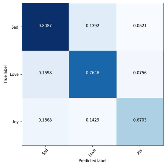 This section shows the results for the transformer-based AraBERT model. For consistency, 80% of the data for training and 20% for evaluation were used. The model training was stopped after three epochs, as training for longer caused overfitting. Overall, the AraBERT model could learn the inputs’ general features without capturing the details, which prevents overfitting. The training and testing accuracies were 76.5%. The performance of this model was better than the previous ones. The outstanding performance of the pre-trained model is probably due to the large pre-trained corpus. Figure 5 presents the confusion matrix of the testing sample. As with the previous approaches, sad poems were classified most accurately (80%), with joy poems being the least accurate (67%). Subsequently, this is most likely due to the dataset having twice as many sad poms as joy poems. We obtained an overall precision, recall, and F1-score of 0.76, 0.77, and 0.77 on the test set, respectively.