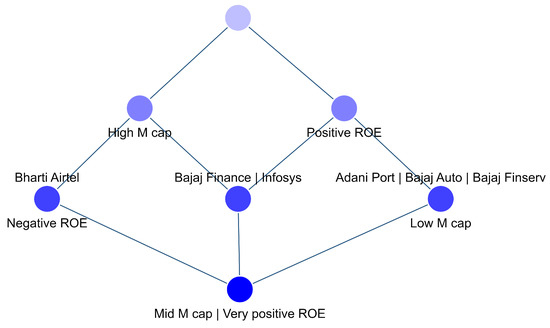 We can now see that concept analysis takes place by analyzing the object and its corresponding attributes. As a grouping of attributes is formed, it is possible to say that clustering is performed internally. For example, if we look at Concept 14, we can see that the stocks are clustered according to their corresponding attributes. Even if a stock is removed from the index, the concept will still survive, as it has a stability index of 1. Thus, for that concept, we can say that the portfolio manager looking for stocks with the attributes { , , } will obtain the following stocks: { Adani Ports, Apollo Hospitals, Axis Bank, Bajaj Auto, Bajaj Finserv}.